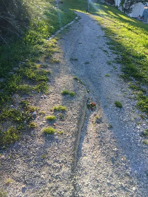 Die Fußkieswege sind wieder einmal unterspült worden durch den Regen, tiefe Furchen, sehr gefährlich für Kinder und Radfahrer.